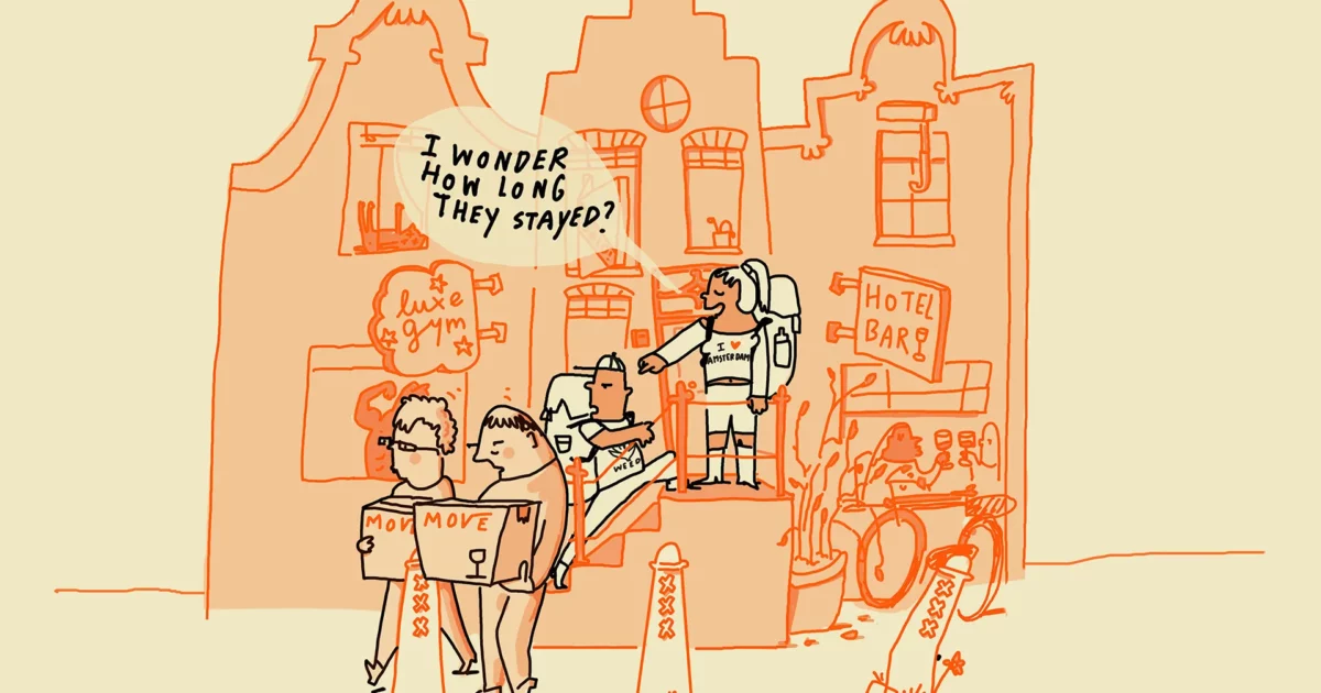 Het is een beeld dat je voor de hele stad kunt gebruiken. Sociaal-geograaf en onderzoeker Jaap Draaisma heeft Amsterdam een hotel genoemd, waar een groeiend deel van de bewoners veeleer bezoeker is. Ze benaderen de stad als een plek om te consumeren of maximaal te benutten, en vervolgens weer te vertrekken. Sommigen komen bewust maar enkele jaren, om te studeren, een partner te vinden of een start met hun carrière te maken. Anderen zouden graag langer willen blijven, maar dat is eigenlijk alleen weggelegd voor welvarende tweeverdieners, mede omdat er nauwelijks gezinswoningen zijn.